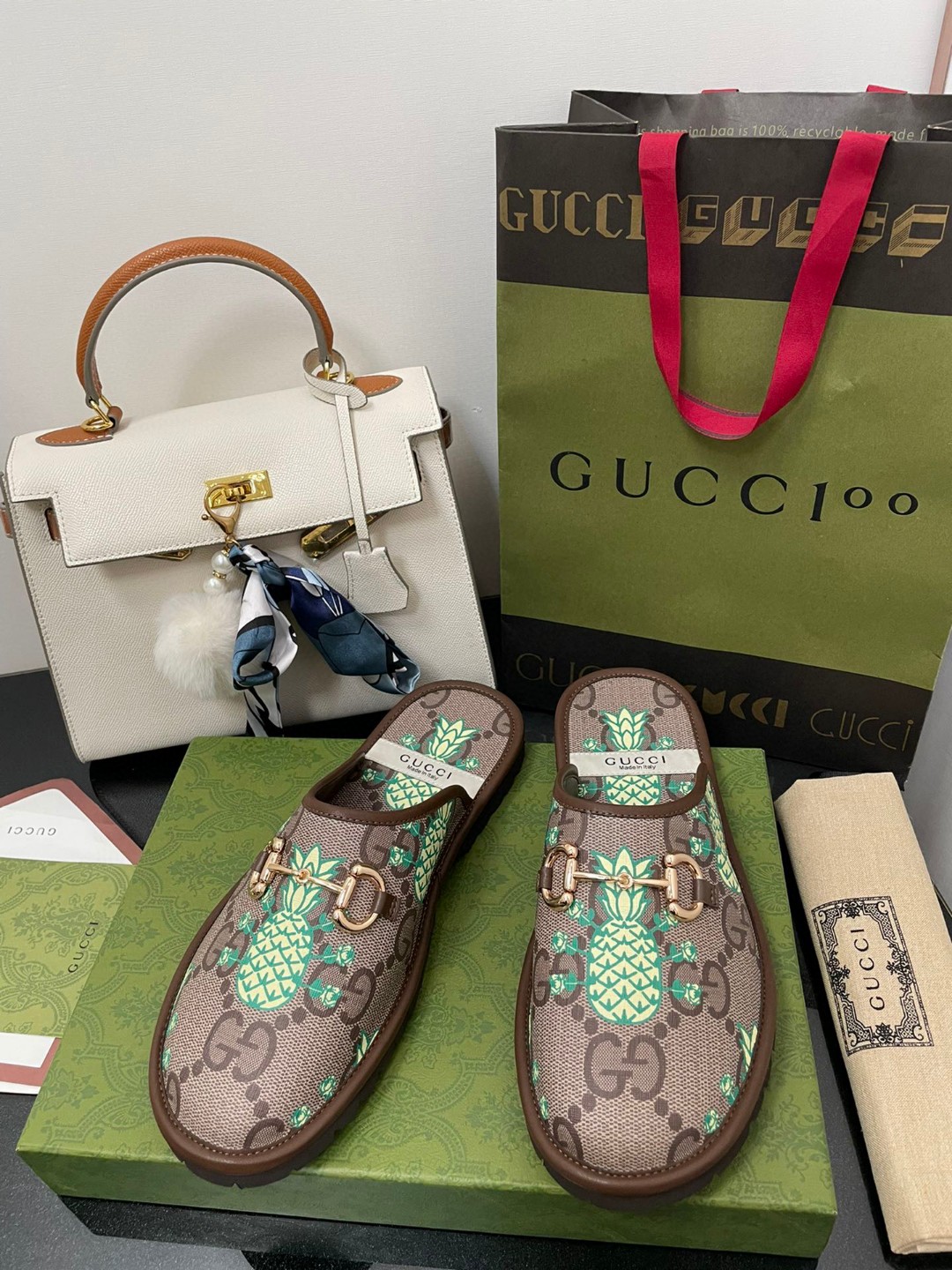 Gvc*1 Men’s GG Slipper With Horsebit Brown in Pineapple Print For Men GG Shoes 694249
